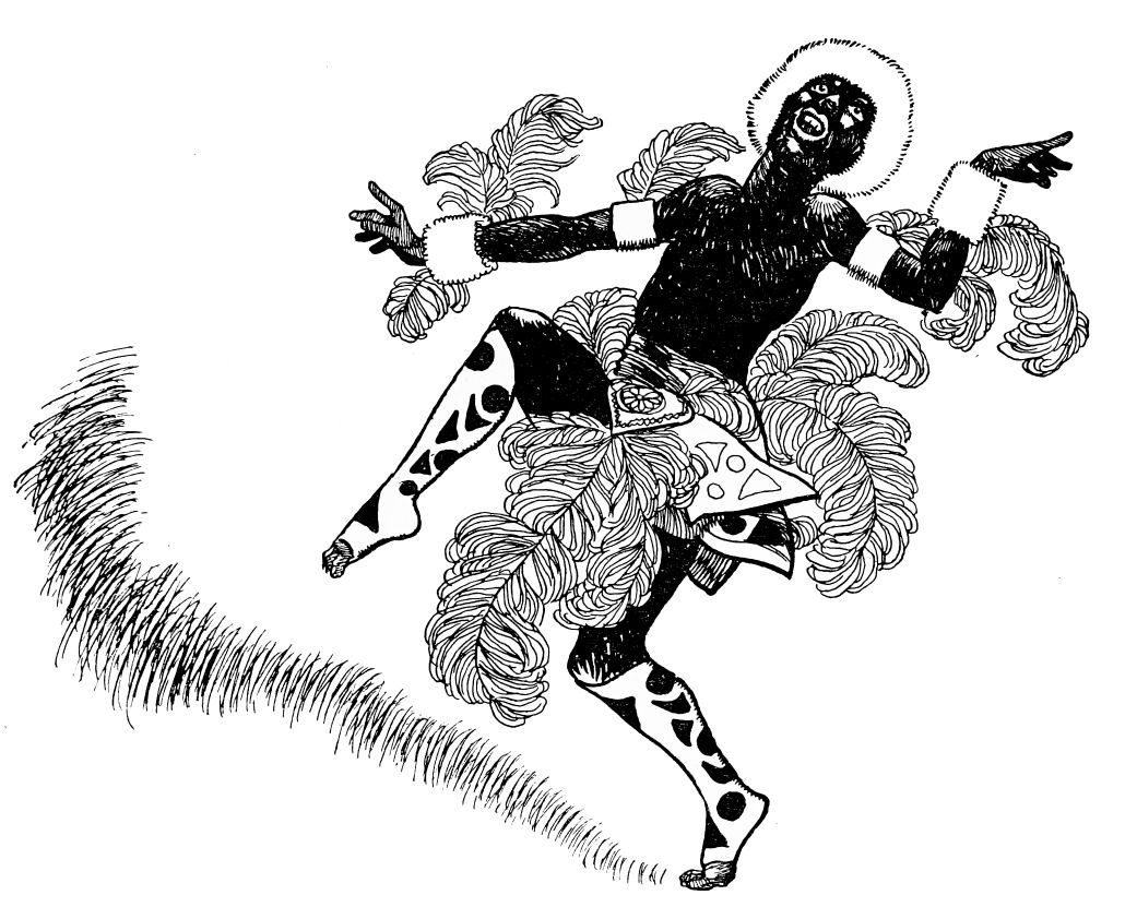 Indolent and stupid, the rival of Pétrouchka is happier than he. Less responsive to the showman’s baneful influence, the swarthy doll{26} has been invested with but little more than the lowest of human appetites and instincts. No dim perceptions of romance are his; his brutish wits have not been sharpened, like Pétrouchka’s, to the point of suffering. Lolling in his gaudy chamber, he passes the time in idleness and folly.