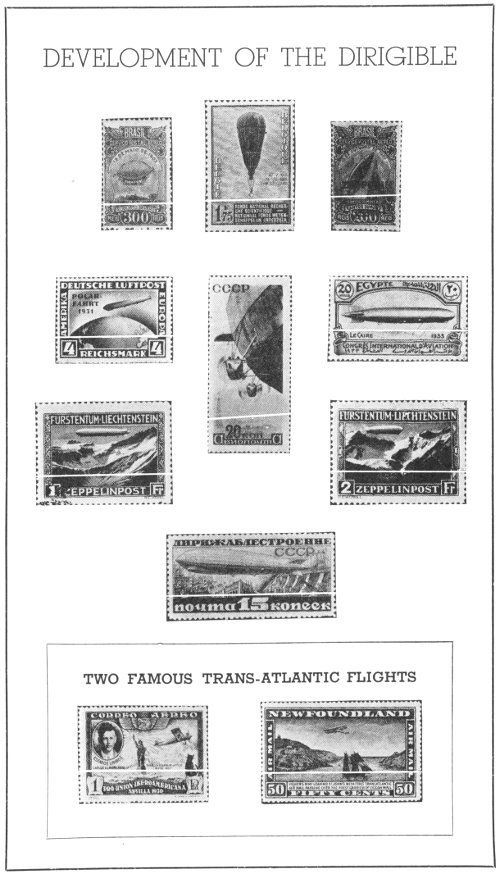 ¶ The air mail stamps existing today bear witness to the importance of this accomplishment. Dozens of them picture the great Zeppelins from their early beginnings to their present state of perfection. Tableaus depicting them over the polar regions, and topping the crags of mountain ranges, and even in the process of construction form a visual history of the balloon.