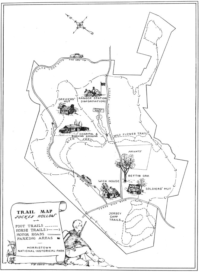 Three-eighths of a mile southwest of the New York Brigade campsite (No. 9), on the west side of the Jockey Hollow Road, area picnic area and rest rooms. Parking facilities are provided close to the road. From that point a winding foot trail 36 (pp. 20, 35) leads to open places among the trees where tables and benches are placed for the convenience of visitors who wish to bring basket lunches. No fires are permitted, either here or elsewhere in the park.