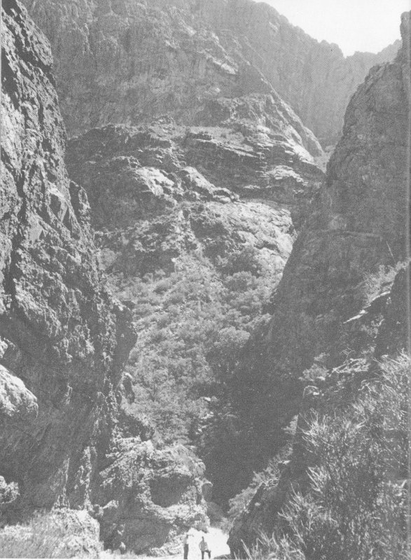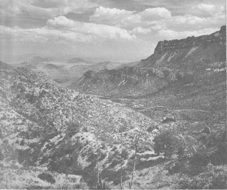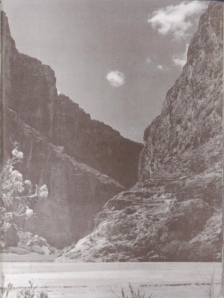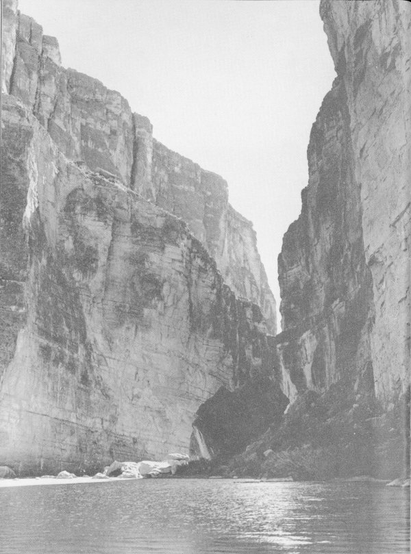 Here, a deep gash in the mesa de Anguila and Sierra Ponce marks the course of the river for eighteen miles. Through millions of years, the silt and gravel laden waters have continued their endless task of grinding away the limestone bit by bit until now the walls of the canyon rise perpendicularly more than fifteen hundred feet above the waters of the river.