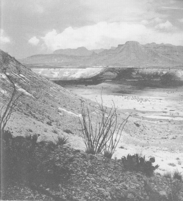 Today, the Big Bend visitor travels through the Park near the Old Comanche Trail. South of Persimmon Gap the Park road dips into an expansive plain, which is traversed by Tornillo Creek and the Tornillo Flats. Many miles beyond a hazy blue ridge marks the outline of the Chisos Range.