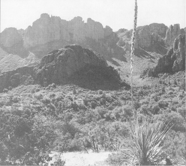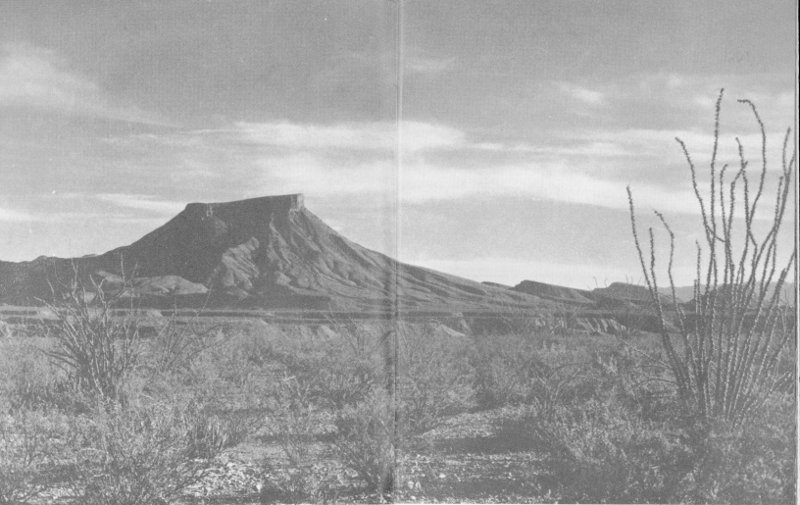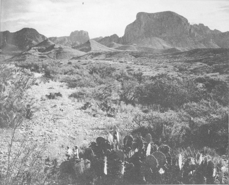 THE CHISOS MOUNTAINS—The plains gradually slope up into hills that end against the Chisos Mountains. Just left of center is Casa Grande and the profile of Chief Alsate is at the upper right.