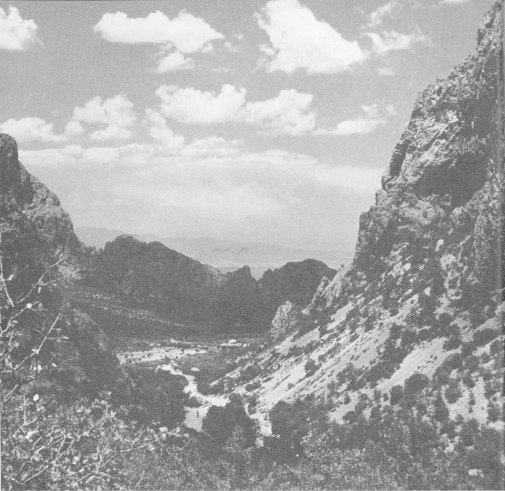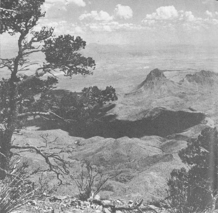 Outstanding in natural phenomena the scenic features of Big Bend National Park comprise a variety of spectacular attractions. In addition to the canyons of the Rio Grande, numerous colorful arroyos dip below the plains in appalling vistas of sand, rock and scrub vegetation of the desert. Buttresses push their towering masses into the azure sky, revealing a graphic account of endless battles with the elements. The uncovered strata opens the book of geologic history. High in the Chisos Mountains, majestically reigning over the Basin, Casa Grande, an erosive remnant of rhyolite, rises 7,300 feet above sea level. This massive monolith is a conspicuous landmark, photogenic in its moods of shifting lights and shadows. Climaxing the mountain scenery are the outstanding vistas that unfold from the South Rim of the Chisos Mountains. From this lofty plateau, more than 7,000 feet above sea level and a mile above the sprawling valley of the Rio Grande, the extensive awe-inspiring view reaches far into Old Mexico. To the east, blue and purple in the distance, ranges of the Sierra del Carmen and Sierra Fronterisa pose in their grandeur. More than a hundred miles to the south the distant Sierra Madres form the horizon line in Mexico and the Mesa de Anguila forms a sharp outline to the west. Dropping sheer from the South Rim, precipitous cliffs slope into the Lower Chisos, more than 1,000 feet below the rim.