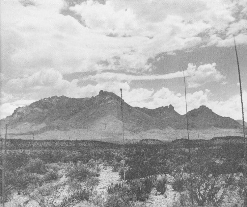 THE CHISOS MOUNTAINS—At a distance of ten miles across the plains, the Chisos Mountains form a bold outline against the sky. This mountain group reaches an elevation of 7,835 feet above sea level.
