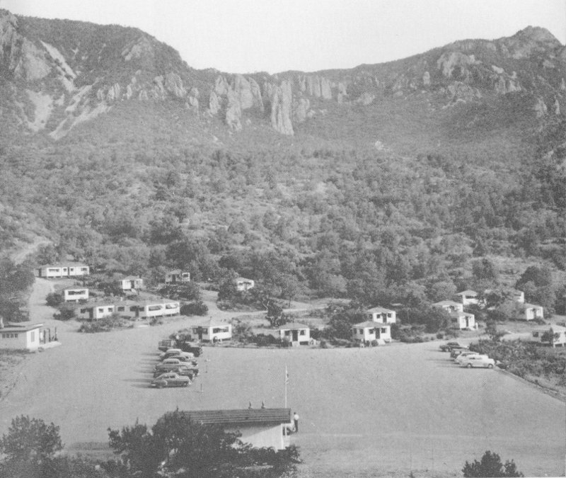 MOUNTAIN COTTAGES IN THE CHISOS BASIN—The Cottages and other accommodations, located at an elevation of 5,400 feet, are completely surrounded by towering mountains. Emory Peak, at the upper right, is the highest in the park.