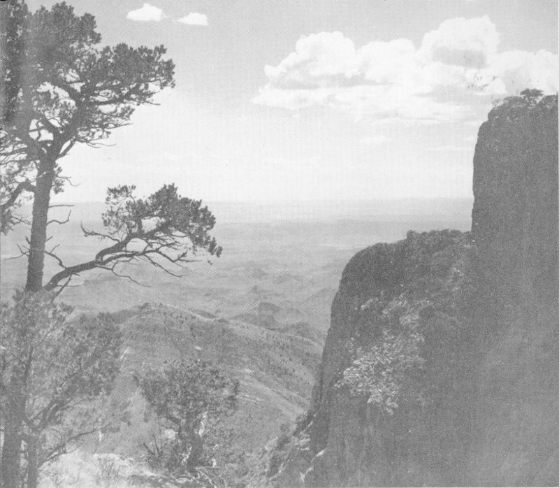 PANORAMA FROM THE SOUTH RIM—Sheer perpendicular cliffs drop more than 1,000 feet from the Rim, sloping into the foothills of the Lower Chisos. Beyond the Rio Grande, in the middle distance, lies the varied terrain of Mexico.