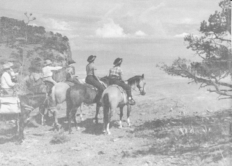 TRAIL RIDERS AT THE SOUTH RIM—Climaxing the scenery along the South Rim Trail is the spectacular vista from the Rim itself. In the distance, the Sierra del Carmen range is visible in Mexico.
