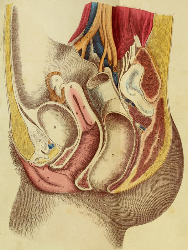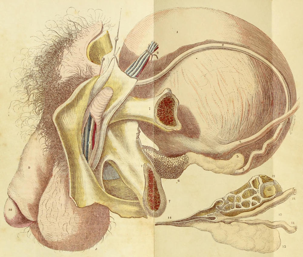 The Generative Organs of man consists of two distinct outward members, called the Penis and the Testes, or Testicles—both together being frequently called the Genitals. The Testes are inclosed in a sac or bag hanging from the pubic bone called the Scrotum, and their functions are to produce the male principle or Semen, as the Ovaries in the female ripen the Ovum or Egg. The Testes are a curious work of Nature. On dissection they are found to be composed of fine blood vessels intermingled with small tubes called the Seminal Tubes, in which the Semen is generated. Some very knowing physicians say that there are sixty thousand of these Seminal Tubes; but we doubt if anybody ever counted them. These tubes, as they leave the Testes, gradually join together until finally a single tube only goes from each Testicle. These are called the Vas Deferens, and they ascend to the abdomen through a larger tube, (which also contains arteries, nerves, lymphatics, &c.,) where they connect with two small organs called Seminal Vesicles. From these vesicles the Semen passes downwards through a tube called the Ejaculatory Canal, which is connected with the Prostate Gland, and from whence it is forced to the Urethra or urinal passage, and so out of the body. This is a brief outline of all the organs connected with the generative system of man: the Testes have the peculiar property of making the Semen—the Vas Deferens and the Ejaculatory Canal carry it into the abdomen to the Prostate Gland, from whence it is conveyed, by a peculiar but spasmodic effort, through the urinal passage in the Penis into the body of the female. It is supposed that the Seminal Vesicles and Prostate Gland impart a vital principle to the Semen, and that the peculiar[6] pleasurable feeling experienced during connection with the female springs from these organs.