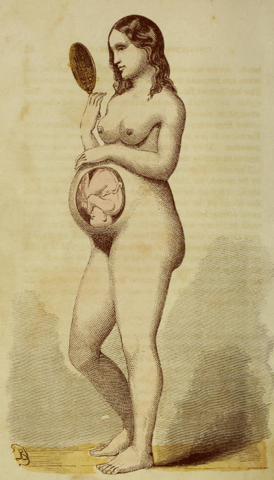 The anxiety of a woman who desires to avoid pregnancy will often lead her to such dangerous extremes that she is ready to risk health, and even life itself, rather than become a mother. Hence she earnestly seeks the means to destroy her unborn child. When this is done so early that the fœtus cannot live, it is called an abortion. After the sixth or seventh month, it is a miscarriage. Abortions are always dangerous, though some females get over them without much suffering or harm. The most propitious periods for an abortion are at three, five, and six months. Both abortions and miscarriages are brought about by irregularities of conduct, such as too eager gratification of sexual desires, remaining too long in a warm bath, lacing the corsets too tight, violent exercise, such as dancing, riding a hard trotting horse, romping, jumping long distances, &c. Any of these imprudences will be apt to kill the fœtus, which will soon thereafter be expelled from the womb. Women know the moment the fœtus dies, for it falls to the bottom of the abdomen and lies there a dead weight, feeling like a foreign substance in the body.