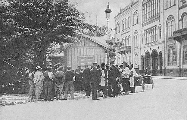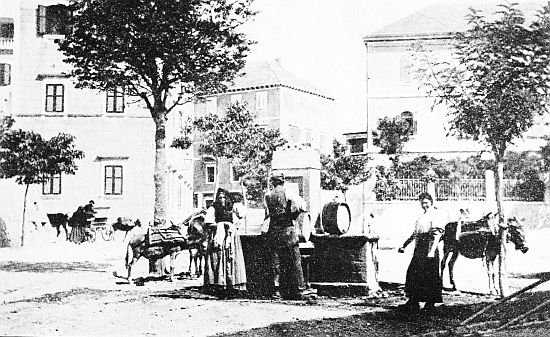 Among the historical landmarks in the town of Zara, the Cinque Pozzi, or Five Fountains, constitute one of the most prominent. They stand in a row in front of a broad flight of stone steps, which lead up to a shady park overlooking the docks and part of the city. These fountains are more like cisterns and from them the poorer inhabitants still draw their water, carrying it away in great jars upon their heads. They were designed by Sammichieli, an architect of Verona, and built in 1574. To them the water is conducted from sources outside the city, first passing through a rather elaborate system of subterranean filtration. An architect living in Zara has in his possession a copy of a plan of these filters as designed by Sammichieli himself.