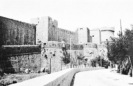 When our eyes had become accustomed to peering out into the darkness, for it is almost as beautiful to ride at night through these channels as it is in the daytime and for [270]that reason we eschewed our berths, those of us who had remained on deck could distinguish, as we passed, the silhouette of the island of Kraglievaz, or King’s Seat, upon which Bela IV secluded himself from the pursuit of the Tartars. Then we plowed through a veritable shoal of islands and passed an isolated rock, formerly crowned by the Benedictine monastery of St. Arcangelo. Farther along, near the famous headland of La Planca (the Promontorium Diomedis of the Romans), we passed a little chapel, built by a thankful mariner who, while sailing up the coast with a cargo of Malvasia wine, suffered shipwreck on the rocks and made ingenious use of his cargo to mix the mortar with which to bind the stones of this little monument of appreciation of his rescue.