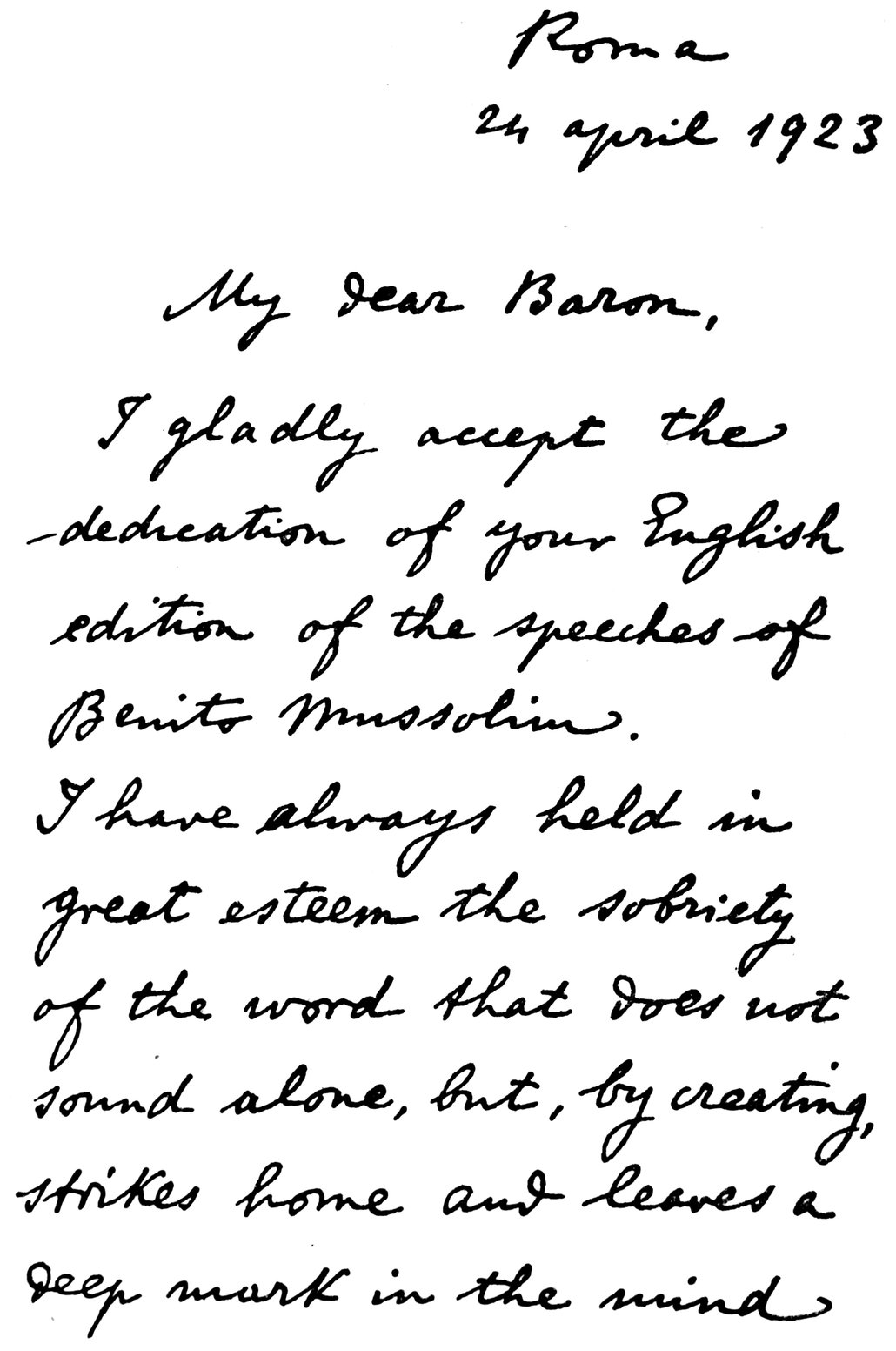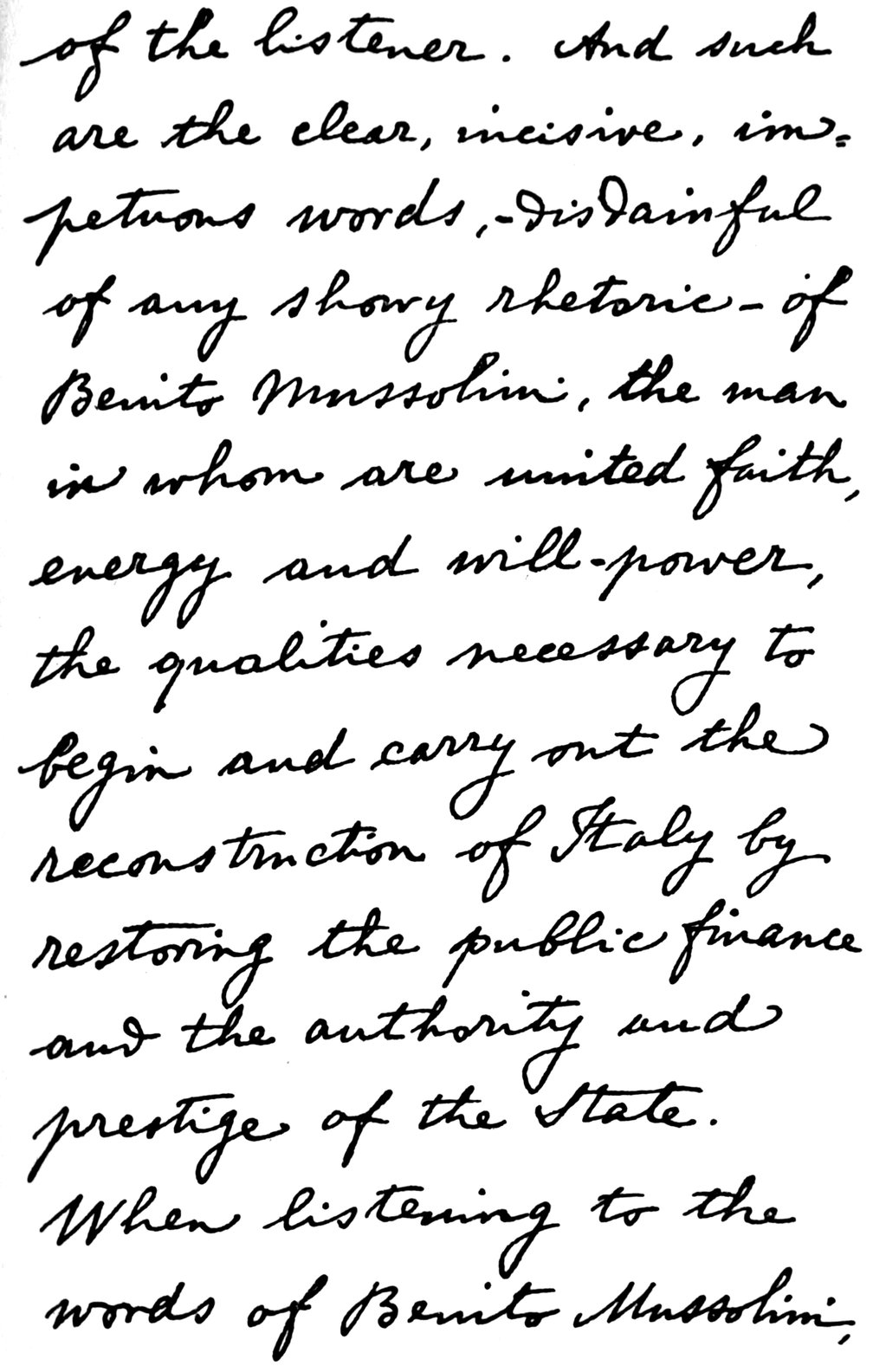 During the last eight months Italy has made an extraordinary contribution to the whole world by raising ideals of human courage, discipline, and responsibility. I would be unfaithful to my beliefs and to those of hosts of Americans if I failed to acknowledge the part played by your President of Council, Mussolini, with the people of Italy, in giving to all mankind an example of courageous national organisation founded upon the disciplined responsibility of the individual to the State, upon the abandonment of false hopes in feeble doctrines, and upon appeal to the full vigorous strength of the human spirit.