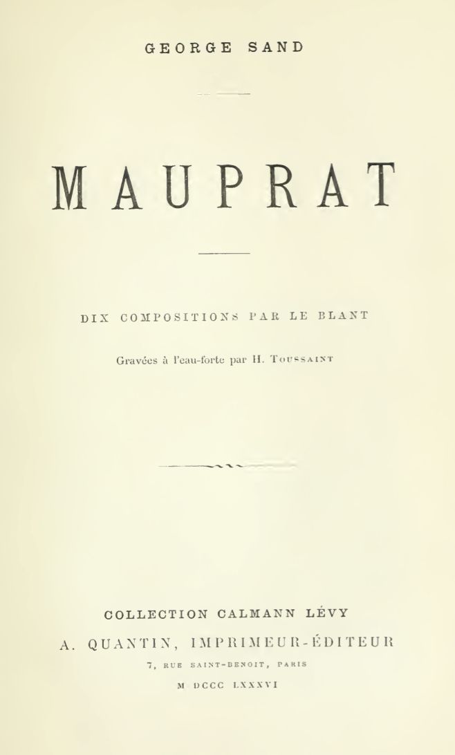 Il y avait la branche aînée et la branche cadette des Mauprat. Je suis de la branche aînée. Mon grand-père était ce vieux Tristan de Mauprat qui mangea sa fortune, déshonora son nom, et fut si méchant, que sa mémoire est déjà entourée de merveilleux. Les paysans croient encore voir apparaître son spectre alternativement dans le corps d'un sorcier qui enseigne aux malfaiteurs le chemin des habitations de la Varenne, et dans celui d'un vieux lièvre blanc qui se montre aux gens tentés de quelque mauvais dessein. La branche cadette n'existait plus, lorsque je vins au monde, que dans la personne de M. Hubert de Mauprat, qu'on appelait le chevalier parce qu'il était dans l'ordre de Malte, et qui était aussi bon que son cousin l'était peu. Cadet de famille, il s'était voué au célibat; mais, resté seul de plusieurs frères et sœurs, il se fit relever de ses vœux et prit femme un an avant ma naissance. Avant de changer ainsi son existence, il avait fait, dit-on, de grands efforts pour trouver dans la branche aînée un héritier digne de relever son nom flétri et de conserver la fortune qui avait prospéré dans les mains de la branche cadette. Il avait essayé de remettre de l'ordre dans les affaires de son cousin Tristan, et plusieurs fois apaisé ses créanciers. Mais, voyant que ses bontés ne servaient qu'à favoriser les vices de la famille, et qu'au lieu de déférence et de gratitude, il ne trouverait jamais là que haine secrète et grossière jalousie, il renonça à tout accord, rompit avec ses cousins, et, malgré son âge avancé (il avait plus de soixante ans), il se maria afin d'avoir des héritiers. Il eut une fille, et là dut finir son espoir de postérité; car sa femme mourut, peu de temps après, d'une maladie violente que les médecins appelèrent colique de miserere. Il quitta le pays et ne revint plus que très rarement habiter ses terres, qui étaient situées à six lieues de la Roche-Mauprat, sur la lisière de la Varenne du Fromental. C'était un homme sage et juste, parce qu'il était éclairé, parce que son père n'avait pas repoussé l'esprit de son siècle et lui avait fait donner de l'éducation. Il n'en avait pas moins gardé un caractère ferme et un esprit entreprenant; et, comme ses aïeux, il se faisait gloire de porter en guise de prénom le surnom chevaleresque de Casse-Tête, héréditaire dans l'ancienne tige des Mauprat. Quant à la branche aînée, elle avait si mal tourné, ou plutôt elle avait gardé de telles habitudes de brigandage féodal, qu'on l'avait surnommée Mauprat Coupe-Jarret. Mon père, qui était le fils aîné de Tristan, fut le seul qui se maria. Je fus son unique enfant. Il est nécessaire de dire ici un fait que je n'ai su que fort tard. Hubert Mauprat, en apprenant ma naissance, me demanda à mes parents, s'engageant, si on le laissait absolument maître de mon éducation, à me constituer son héritier. Mon père fut tué par accident à la chasse à cette époque, et mon grand-père refusa l'offre du chevalier, déclarant que ses enfants étaient les seuls héritiers légitimes de la branche cadette, qu'il s'opposerait, par conséquent, de tout son pouvoir à une substitution en ma faveur. C'est alors que Hubert eut une fille. Mais lorsque, sept ans plus tard, sa femme mourut en lui laissant ce seul enfant, le désir qu'avaient les nobles de cette époque de perpétuer leur nom l'engagea à renouveler sa demande à ma mère. Je ne sais ce qu'elle répondit; elle tomba malade et mourut. Les médecins de campagne mirent encore en avant la colique de miserere. Mon grand-père était demeuré chez elle les deux derniers jours qu'elle passa en ce monde...