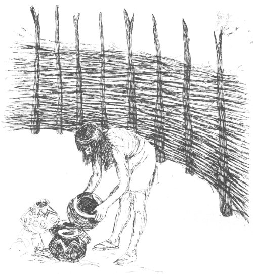 Near the far wall of the house, archeologists found a large pit containing stones piled on a bed of sand. This was probably a heating pit. In the evening, stones would be heated in the hearth, then placed on the sand. They would radiate heat for several hours, warming the air near the floor where the people slept.