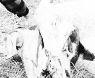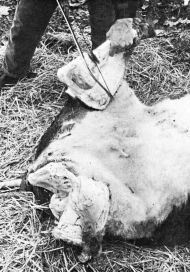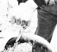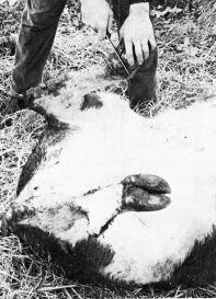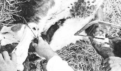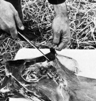 The easiest and safest method for quick bleeding is to bleed the animal while it is still on the ground. Standing behind the animal, grasp the lower jaw (fig. 5), pull the head back slightly, and cut across the throat from ear to ear as deeply as possible (fig. 6). If the blood does not flow freely, cut deeper. A sharp skinning or boning knife is appropriate for this part of the operation.