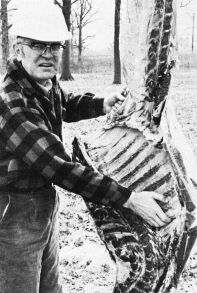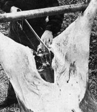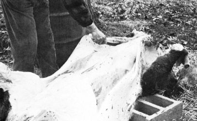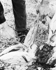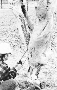 “Pumping” the animal will assure more complete bleeding. This can be accomplished by lifting the hindquarter with the tail, pulling the foreleg, and applying a pumping motion with a foot in the flank (fig. 7).