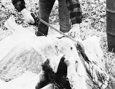 To remove the foreleg, cut through the hide and tendons at the joint closest to the foot. This joint is approximately 1 inch above the bony rise in the knee. Split the hide from the dew claws to the original cut and skin out the forelegs. Remove the forelegs with a knife or saw at the original cut (fig. 14).