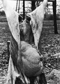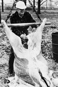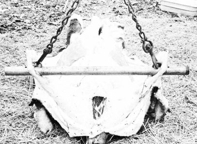 Selection of the slaughter site is extremely important. A site with clean, running water is best. If a tree is to be used, a healthy limb 6 to 8 inches in diameter and 12 to 15 feet from the ground is needed. This will ensure that the limb will not break from the weight of the carcass and the carcass can be fully extended from the ground for viscera removal and splitting. If slaughter is to be done in a barn, be sure that a strong beam 12 to 15 feet from the floor is available. The floor should be clean and, preferably, concrete.