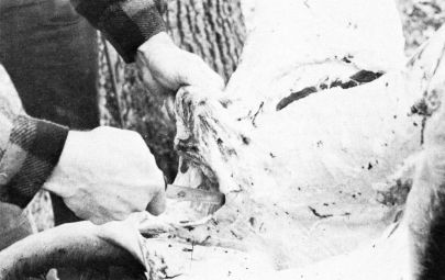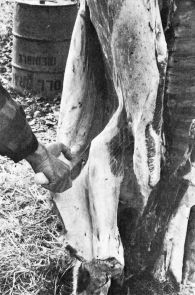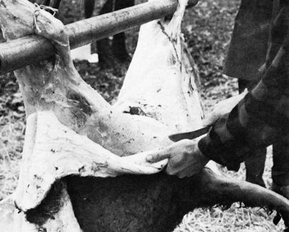 Return to the rear of the carcass and remove the hide left on the inside of the rounds (fig. 23). Do not skin the outside of the round because this can be done more easily after the carcass is hoisted.