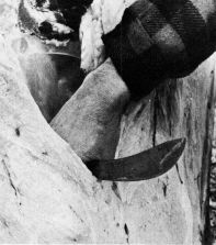 2. Honing (fig. 2) is accomplished on a carborundum stone. Stones should be set in a block of wood or placed on a damp cloth to prevent lateral sliding. Hold the handle of the knife in the right hand with the blade edge pointed away from your body. Assume a position parallel to the side of the stone and place the heel of the knife blade on the end of the stone to your extreme left. Tilt the blade of the knife enough to make the bevel lie flat with the stone. Place the finger tips of the left hand on the flat of the blade toward the tip and near the back edge to exert pressure on the blade. It is very important for safety that the fingers of the left hand push downward only to maintain an even pressure on the knife blade over the stone. If the left hand pushes laterally with the sharpening stroke, and the knife catches on an irregularity, then the fingers will slip off the edge and can be cut severely by the freed knife blade. With a sweeping motion toward the right of the stone, draw the knife completely across the stone, against the cutting edge of the blade. The correct motion is achieved when that portion of the blade nearest the handle begins the stroke and the extreme tip of the blade ends the stroke. The procedure is reversed to hone the opposite side of the blade.