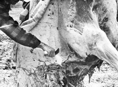 Begin removal of the hindlegs by cutting through the hide and tendons between the sole of the foot and the dew claws (fig. 10). Split the hide from the dew claws down the leg to the hock and over the rear of the round to a point about 6 inches below the hock and remove the hide from each hindleg (fig. 11). Remove the hindleg by cutting through the joint closest to the foot with a knife or saw (figs. 12 and 13). Be careful not to cut the large tendons just below the hock for they will be needed when hoisting the carcass.