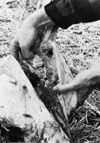 If brain removal is desired, continue the split through the poll and down the center of the face. After sawing half way down the face, pull the halves of the head apart and remove the brains (fig. 63). Wash the brains thoroughly, checking for bone fragments. If the animal has been shot the brain will contain metal fragments and should not be saved.