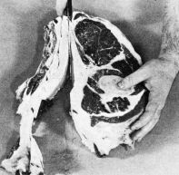Bruises, minor injuries, parasites in the organs and enclosed abscesses, and single tumors are frequently local conditions that can be easily removed. However, the presence of congestion or inflammation of the lungs, intestines, kidneys, inner surface of chest or abdominal cavity, and numerous yellowish or pearl-like growths scattered throughout the organs should be viewed seriously. Carcasses and viscera having such abnormalities should be examined by a graduate veterinarian and his opinion obtained as to the wholesomeness of the meat. You should check with a cooperating veterinarian before slaughtering the animal to be certain he will be available if you should seek his advice.