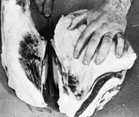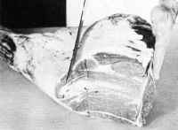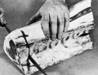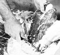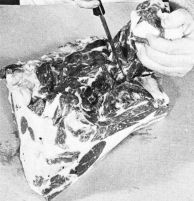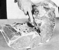 Split the pelvic bone by first locating the seam between the rounds, then following this seam to the bone and cutting through the bone with a knife or saw (figs. 41 and 42).