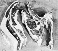 The rib is separated from the short plate by a saw cut across the ribs (fig. 95) approximately 2 to 3 inches from the edge of the ribeye. Rib steaks and roasts (figs. 96 and 97) are made by cutting between the ribs and sawing through the backbone. The protruding edge of the backbone may be removed by sawing through the spinal cord groove.