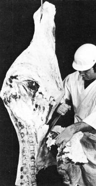 The surfaces of freshly slaughtered beef carcasses are contaminated with bacteria that can spoil the meat unless their growth is promptly checked. Bacterial growth can be slowed by prompt chilling and keeping the carcass at low temperatures. If the weather is suitable (28° to 35° F), the carcass or quarters can be wrapped in a sheet and hung to chill in a well-ventilated shed. Wrapping with a clean cloth will partially protect the carcass from contamination and help smooth out the fat on the outer surface.