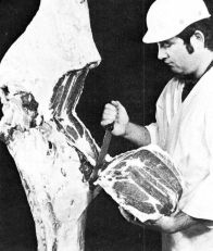 The trimmed hindquarters should be laid on the table with the split surface of the backbone down. Starting at the smaller end of the hindquarter, the club, T-bone, porterhouse, and sirloin steaks are removed by cross-sectional cuts with knife and saw (fig. 111). The last sirloin steak is determined by the cut that passes through the hip joint (fig. 112).