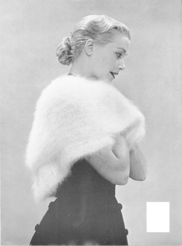 Using 1 strand each of Angora and Metallo, cast on 3 sts. Work back and forth on circular needle as follows: Rows 1, 3 and 5: K, inc 1 st in each st. Rows 2 and 4: Knit. Break off Metallo. Row 6: Using Angora only, insert needle in first st as if to K, wrap yarn around needle twice and draw through this st, take st off left hand needle, * insert needle in next st as if to K, wrap yarn around needle twice, and draw through this st, take st off left hand needle, repeat from * to end of row. Row 7: Join Metallo and using 1 strand each of Metallo and Angora, * K, drop extra wrap loop off needle to form long st, inc 1 st in next st, drop extra wrap off needle, repeat from * to end of row. Row 8: Knit. Row 9: * K 1, inc 1 st in next st, repeat from * to end of row. Break off Metallo. Row 10: Repeat Row 6. Row 11: Join Metallo and using 1 strand each of Metallo and Angora, * K 2, forming long st in same manner as before, inc 1 st in next st, repeat from * to end of row. Row 12: Knit. Row 13: * K 3, inc 1 st in next st, repeat from * to end of row. Break off Metallo. Row 14: Repeat Row 6. Continue in this manner to inc 18 sts in one row every other row, working a drop st row every 4th row until there are 7 drop st rows. Then inc 6 sts at even intervals every other row until there are 13 drop st rows. Using 1 strand each of Metallo and Angora, work 6 rows, still inc 6 sts every other row. Bind off.