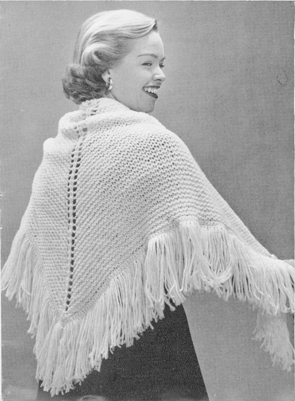 DIRECTIONS: Cast on 3 sts. Row 1: K 1 y o, K 1, y o, K 1. Row 2: K 2, P 1, put a marker on needle, K 2. Row 3: Inc 1 st in first st, K to marker, y o, sl marker to right hand needle, K 1, y o, K to last st, inc 1 st in last st. Row 4: K to 1 st before marker, P 1, K to end of row. Repeat Rows 3 and 4 until there are 181 sts on needle. Bind off.