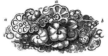nucleus, and the remains of an echinus and spine, shell, and coral,