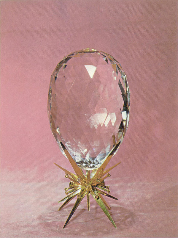 Faceted, egg-shaped, 7000-carat rock crystal from Brazil. The gold stand is inset mostly with Montana sapphires. The gem was cut and the stand was designed and constructed by Capt. John Sinkankas of California. (7¼ inches high in all.)