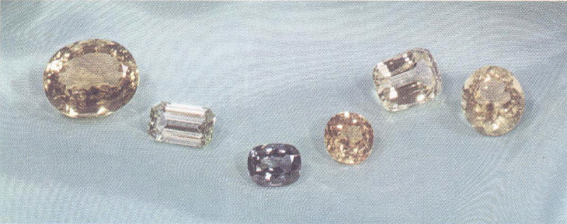 The beautiful colors of these brilliant zircons are the result of heat treatment given to natural, reddish brown stream pebbles. The three stones at the left (from top) weigh 118, 103, and 98 carats, and the ones on the right weigh 106 and 29 carats. The 106-carat stone came from Thailand, the others from Indochina. (Four-fifths actual size.)