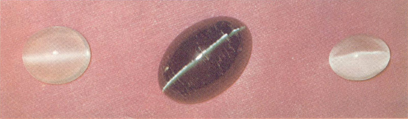 A 43-carat albite from Burma (at left), 76-carat tourmaline from Brazil, and 30-carat wernerite from Burma exhibit a strong cat’s-eye effect because of reflection from inclusions in parallel arrangement within the stones. (Actual size.)