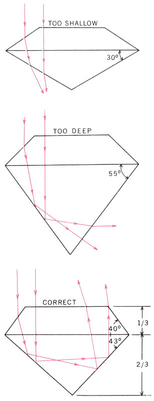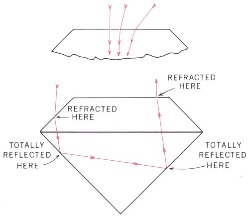 The diagram shows a brilliant-cut diamond with angles and facets arranged to give the stone maximum internal reflection as well as to make use of its strong dispersive ability. Certain of the light beams passing into a brilliant-cut diamond produce colorless brilliance by being reflected back out of the stone 13 through the table by which they entered. Other light beams, emerging through inclined facets, are split up by dispersion into the rainbow, or fire, effect so prized in diamonds. A stone that has been cut too wide for its depth, with incorrect facet angles, will look large for its weight but its brilliance and fire will have been drastically reduced.
