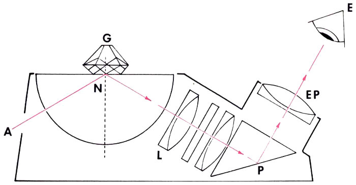 How a gem refractometer, a simple device to operate, is used to measure quickly the refractive index of a cut gemstone. A light beam passing through the opening (A) is reflected from the table of a gemstone (G) through a lens system (L) and, by prism (P), into the eye of the observer (E). The maximum angle of reflection (N), which depends on the refractive index of the gemstone, controls the angle at which the beam comes through the eyepiece (EP). The refractive index is read directly from a scale in the eyepiece.
