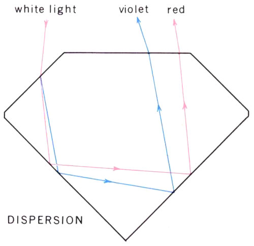 When a ray of ordinary white light enters some gemstones it is dispersed (split up) into rays of the separate colors of which it is composed. These rays are reflected inside the gem and are further separated by additional refraction as they leave the gemstone. This dispersion accounts for the colored flashes of light, or fire, for which diamond is highly prized.