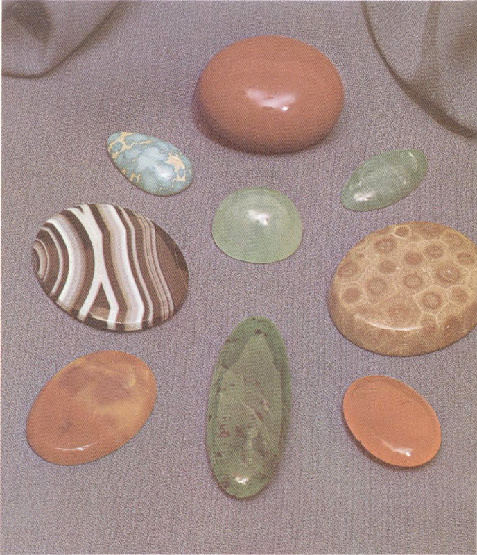 The cabochon cut gets its name from the French word “caboche,” meaning pate or knob, a reference to the rounded top of the stone. Here, from top to bottom, beginning at left, are cabochons of turquoise, agate, and petrified wood; jasper, smithsonite, and williamsite; and amazonite, petoskey stone, and carnelian. (Two-thirds actual size.)