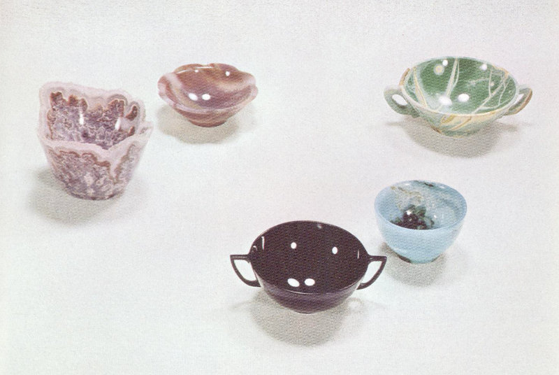 These exquisite bowls, measuring 2 to 3 inches across, are part of a set of 35 carved by George Ashley of Pala, Calif., from gem materials found in the United States. Left to right: paisley agate from California, petrified wood from Arizona, black jade from Wyoming, chrysocolla from Arizona, and variscite from Utah. (One-third actual size.)
