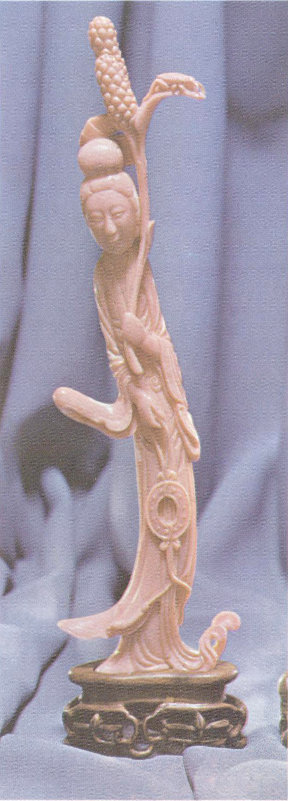 This coral carving, 11 inches tall without the stand, owes its thin, graceful, willowy shape to the skill of the artist in following the contour of a natural coral branch.