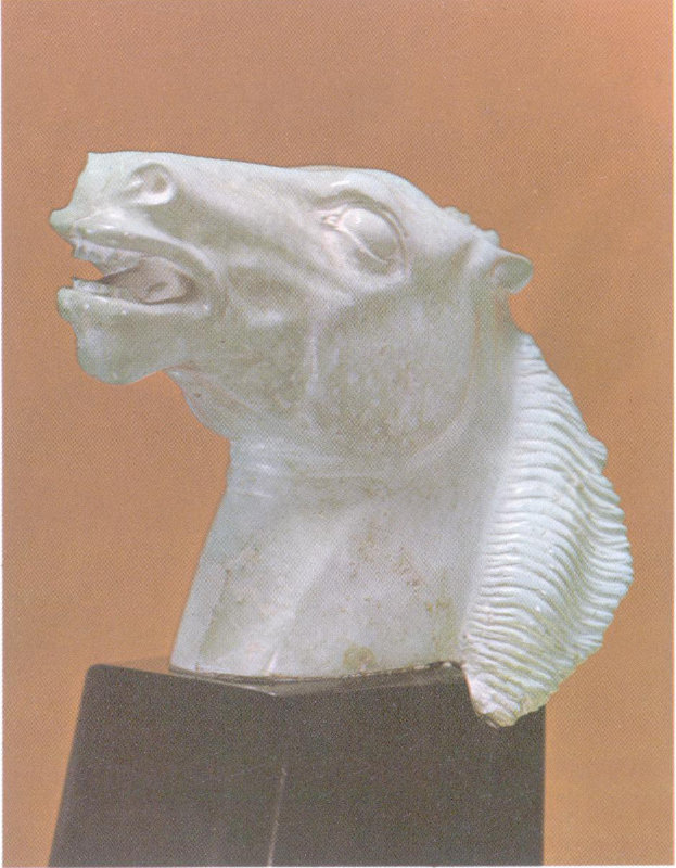 The contemporary sculptor Oskar III J. W. Hansen visualized and created the likeness of a spirited stallion in this 4½-inch turquoise carving, a gift of George Gilmer.