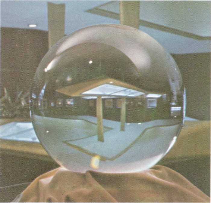 This world-famed crystal ball, given to the Collection as a memorial to W. R. Warner by his widow, represents another phase of the lapidary art. Cut from a block of Burmese quartz estimated to weigh 1000 pounds, this extremely valuable, flawless, colorless sphere has a diameter of 12⅝ inches and weighs 106¾ pounds.