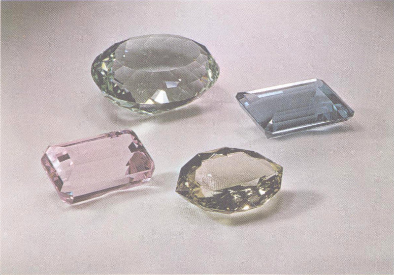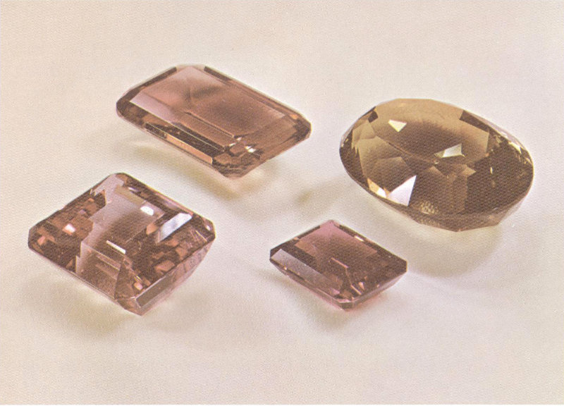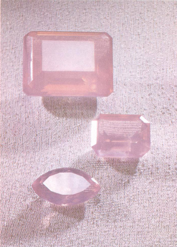 Pastel rose quartz has a delicate beauty in any cut. The 375-carat step cut (top), the 84-carat step cut, and the 46-carat marquise came from Brazil. (Two-thirds actual size.)