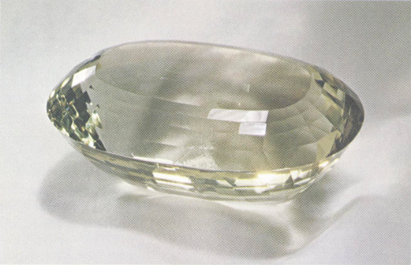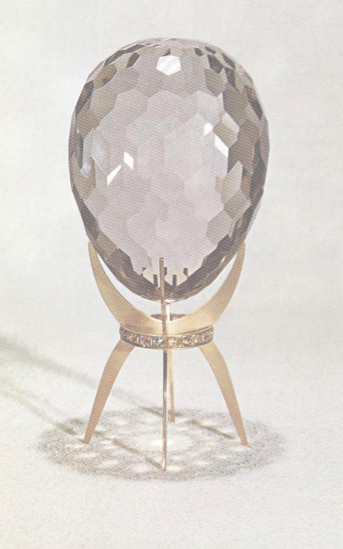 This 4500-carat pale smoky quartz egg from California rests on a gold stand set with Montana sapphires. The unique gem was cut and its stand was designed and made by Capt. John Sinkankas as a difficult exercise in the lapidary art. The quartz egg is 4 inches long and almost 3 inches in diameter.