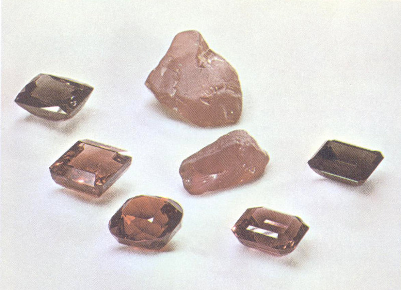 The name citrine (from the French word for lemon) attempts to describe the yellow color of another variety of quartz. Actually, the normal coloring of citrine varies from yellow to red-orange and red-brown, but the yellow sometimes rivals the yellow of topaz. In addition to the normal color range, the colors of citrine may grade through a grayish yellow variety known as cairngorm and a grayish variety called smoky quartz to a black variety called morion. Other varieties that add color dimensions to the group of quartz 49 gemstones are rose quartz and milky quartz. Like amethyst, the reason for the color in rose quartz has not been definitely established. Milky quartz owes its color to myriads of tiny cavities containing water or liquid carbon dioxide.