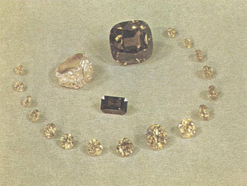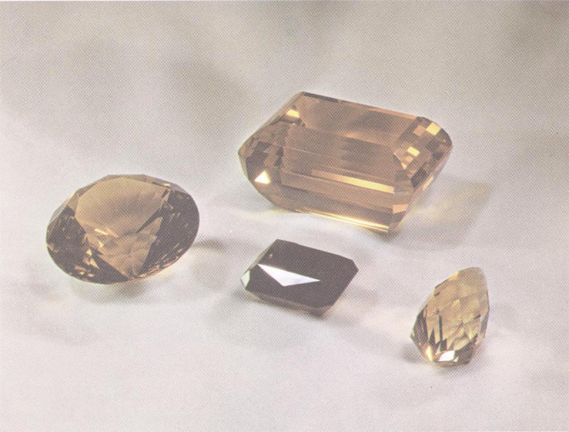 A 783-carat step-cut citrine of deep, rich color dwarfs a 278-carat brilliant-cut citrine (at left), a 90-carat smoky quartz, and a 91-carat briolette of citrine. The smoky quartz, from Switzerland, is so dark that it appears to be opaque. The other three stones came from Brazil. The briolette and brilliant-cut citrines were cut and donated to the Smithsonian Institution by Albert R. Cutter. (Slightly less than half actual size.)