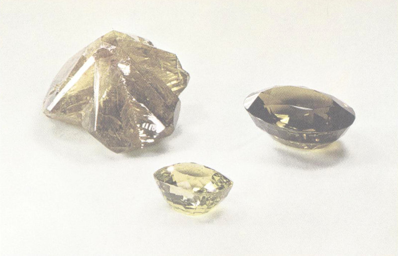 In addition to its fine cat’s-eyes and its color-changing alexandrite varieties, chrysoberyl occurs in handsome stones that vary in depth of color. Shown here with an uncut twinned crystal of gem quality from Brazil are a 46-carat stone from Brazil (left) and a 121-carat stone from Ceylon. The uncut crystal is a gift of Bernard T. Rocca, Sr. (Two-thirds actual size.)